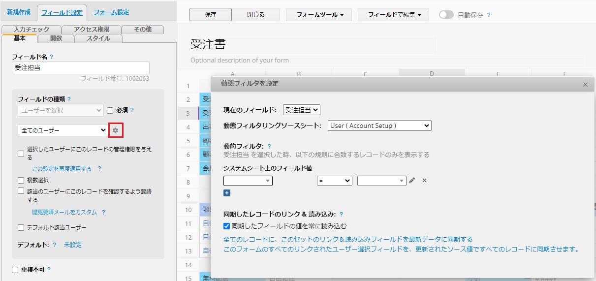 ユーザー選択フィールドはシステムの「ユーザーシート」とリンクしているので、「フィールド設定」の歯車アイコンをクリックして「動態フィルタ設定」を開くこともできます。