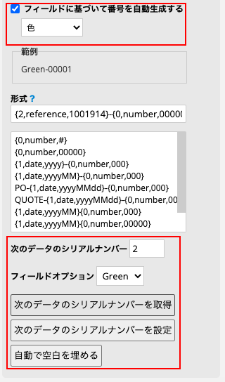 「フィールドに基づいて番号を自動生成する」がチェックされている場合、システムは利用可能な選択肢に従って、それぞれのフィールドに番号を生成します。例えば、選択されたフィールドにA、B、Cの3つの選択肢があり、どれも番号が付けられていない場合。 3つのオプションには、すべて00001から生成します。 つまり、A00001、B00001、C00001、A00002、B00002、C00002...と表示されるわけです。。