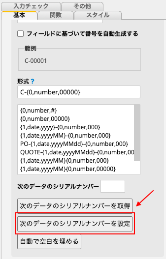 デザインモードでは、次のレコードに付与されるシリアルナンバーを任意の番号に設定・変更することができます。希望するシリアルナンバーを入力し、次のレコードのシリアルナンバーを設定ボタンをクリックしてください。