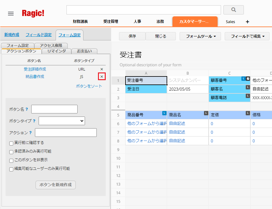 フォームにデザインされたアクションボタンは、左側のツールバー > フォーム設定 > アクションボタンで確認でき、削除したい場合もこちら側から設定できます: