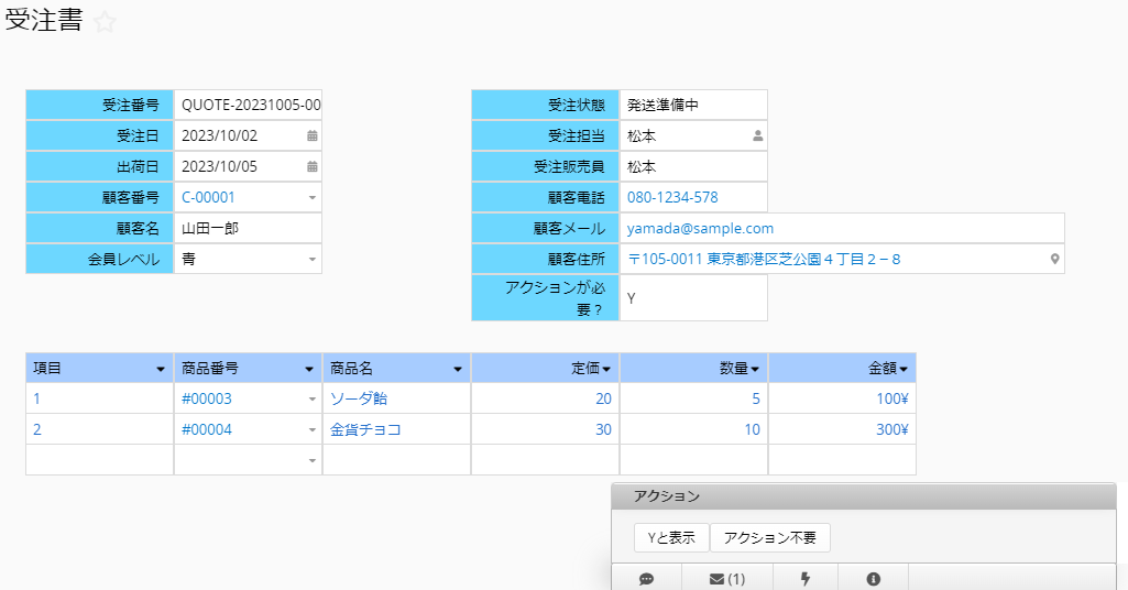 保存後、表示モードに戻ると、フォームページの右下に設定されたアクションボタンが表示されます。設定したアクションボタンをクリックすると、フィールド値が更新されます。