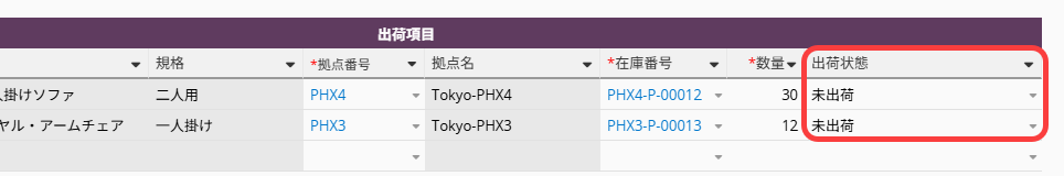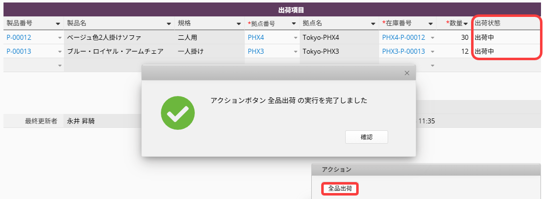 次に「全品出荷」ボタンをクリックすると、子テーブル内の全品目の出荷状況が一度に「出荷」に変更されます。