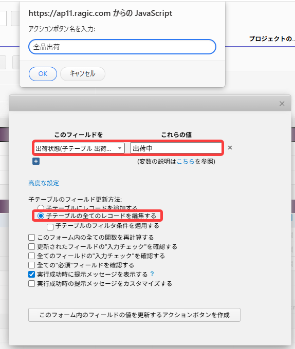 注:「このフォーム内のフィールド値を更新」に何も入力しない場合、フィールド値は空白値に更新されます。「このフォーム内のフィールド値を更新するアクションボタンの作成」を押すと、警告メッセージが表示しますので、空白値に更新する場合は、再度ご確認ください。