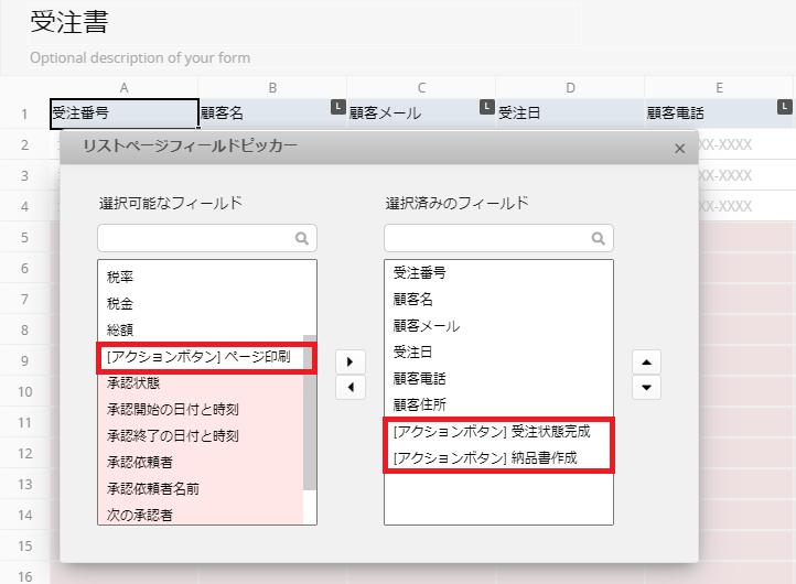 フォーム内にアクションボタンがある場合は、左側のツールバーからドラッグ&ドロップでフィールドに追加することができます。