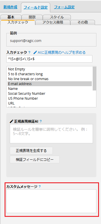 デザインモードからフィールドを選択し、左サイドバーのフィールド設定に移動し、入力チェックタブをクリックします。そして、検証フィールドに正規表現を入力します。