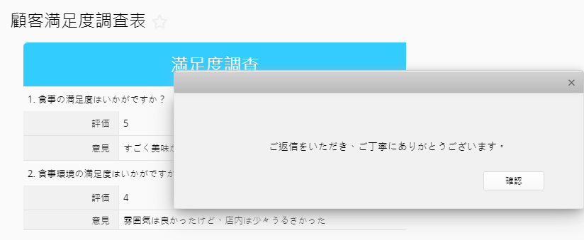 何らかのデータをフォームに追加または編集して保存した後に、応答メッセージやリマインダーを自動的に表示させたい場合は、レコード保存後に表示するメッセージを設定することができます。例えば、アンケートや調査に回答した後に、「返信を受け取りました、ありがとうございました!」。あるいは、注文保存の後に「注文確定後、納品書にコンバートしてください」というリマインダー。