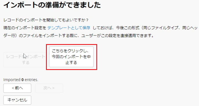 注:「インポートの中止」をクリックしても、インポートはすぐに中止されず、当データのインポートが完了するまで待たされます。 中止を確認した後、インポートの中止を行ったユーザーに通知メールを送付します。