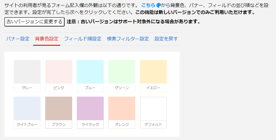 フォームの記入の埋め込むWebパーツを選択すると、その埋め込むパーツが使用されたときの様子が表示されます。 上部ブロックをクリックすると、バナー、テーマカラー、フィールドの配置順など、埋め込みフォームの外観を調整することができます。(また、特別な必要がある場合は、旧バージョンへの切り替えを選択することができます。旧バージョンと新バージョンの違いについては、こちらのリンクをご覧ください。