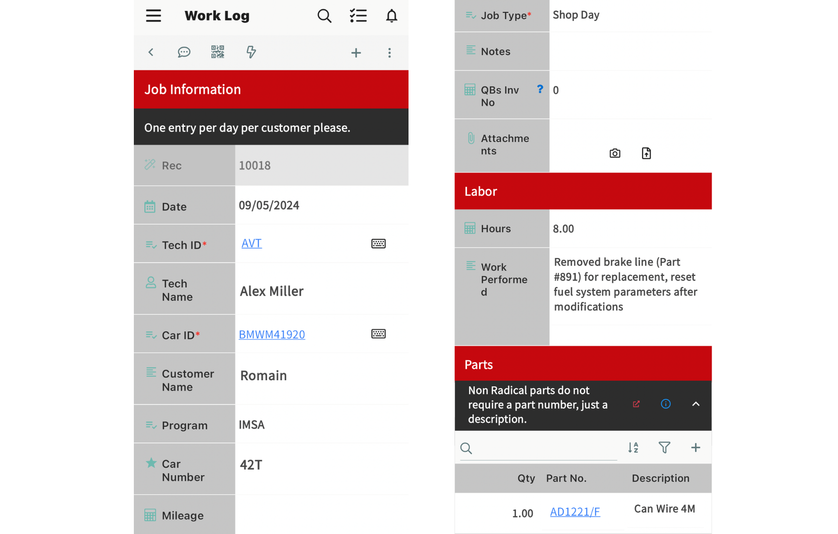 “工作日志(Work Log)可能是整个系统中最主要的表单;它真的是我们使用的表单中最重要的,因为它记录了在所有在车辆上完成的工作、安装的任何零件,还有员工的工时。”