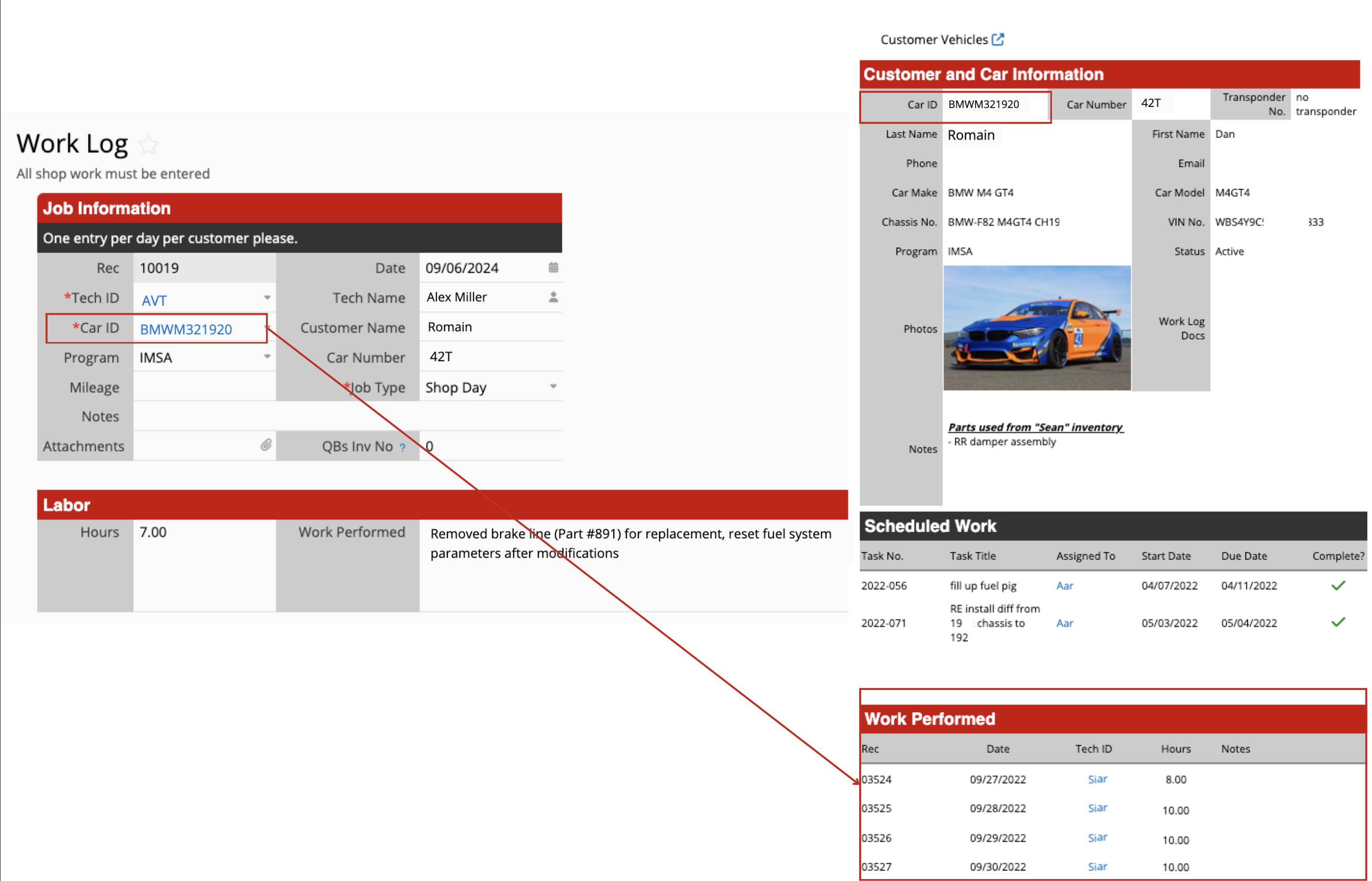 虽然所有数据一开始都输入在工作日志中,但像是链接与加载、显示从其他表单的链接、以及从子表格创建新表单这些 Ragic 的功能,可以让数据在多张表单之间互相关联。例如,当你查看客户车表单时,你可以轻松看到在该车辆上完成的所有工作。