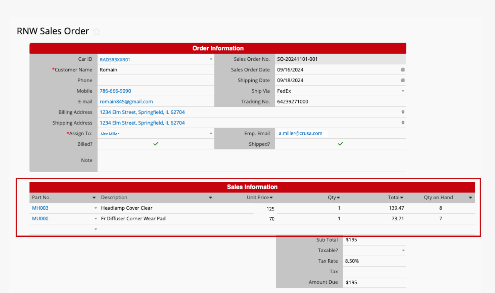 每当他们输入销售订单时,销售订单(RMW Sales Order)子表格会直接链接到 RNW 零件价格清单,实时加载正确价格和可用数量。