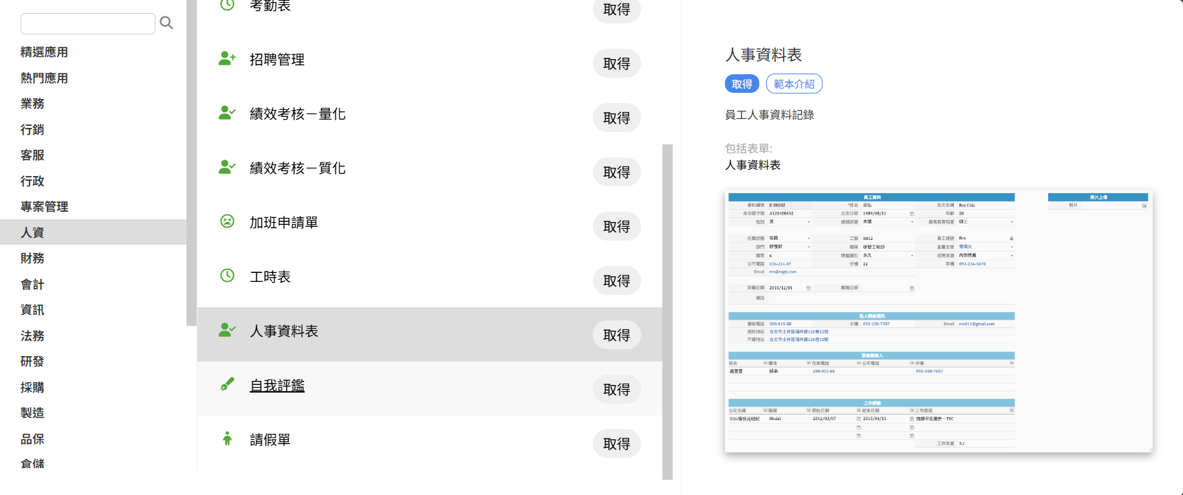 若已经是 Ragic 订户,可以在应用商店的“人资”类别中找到“人事数据表”、“工时表”、“加班申请单”、“请假单”模块并点击“获取”来下载。