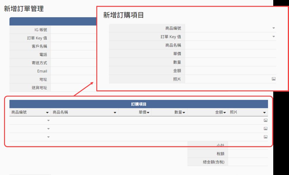 要注意的是,为了有效完成串接,“订单管理”的表单内必须至少有“IG 帐号”、能够记录数据创建日期的“订单日期”以及能够记载购买项目、透过链接与加载连接到“商品”数据的子表格