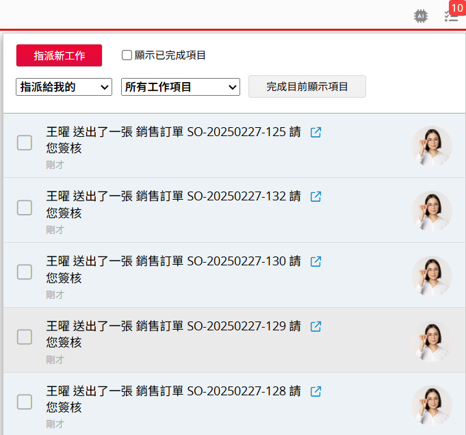 其他用户发起包含你的签核流程时,你会同时收到通知信并显示于工作项目中,当你核准该笔数据后,该项目会自动标号为完成。