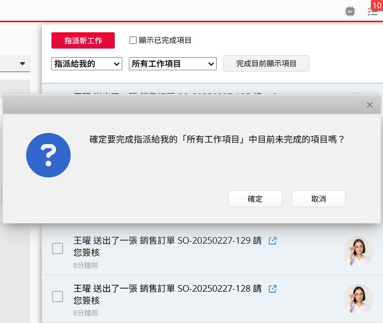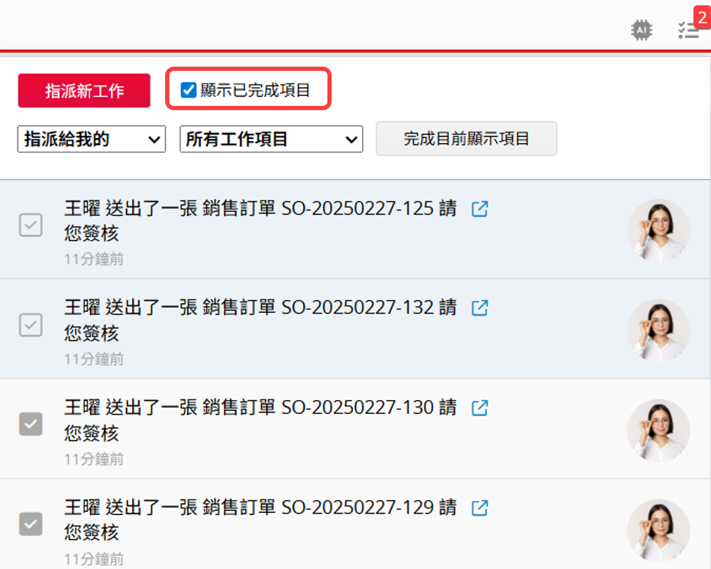 被指派的用户勾选核取方块后,指派人会收到工作完成的通知信。