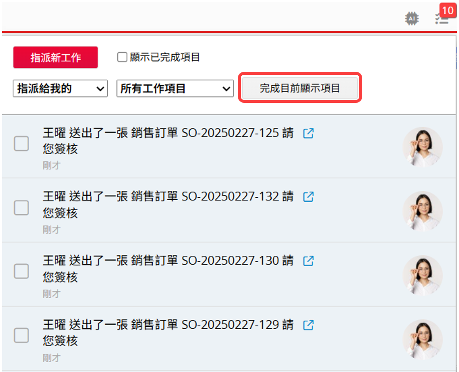系统右上方的任务图符,会显示用户的工作项目,工作项目的来源有:系统自动生成及手动新增,详细说明会在后面提到。当用户勾选后,该项目就会显示为完成,不再显示于项目清单上。