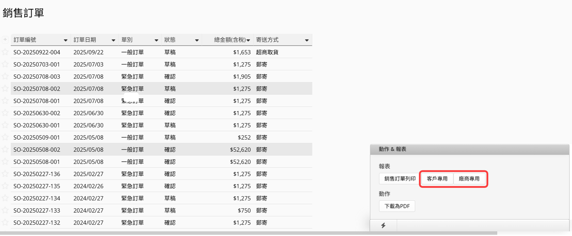 注意:只要有新增保存报表,就会生成一组对应的动作单击钮,此单击钮无法透过删除动作单击钮来移除,只能透过客制打印报表的设置页面删除对应的报表来移除该动作单击钮。