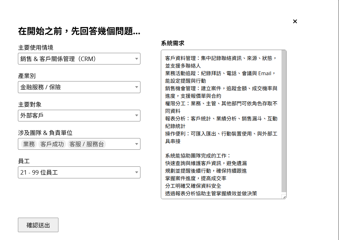 建议尽量具体说明希望系统具备的功能,以及能协助团队完成的工作,并依据这些需求选择合适的项目:情境、产业别、对象、涉及团队与负责单元、员工数量。