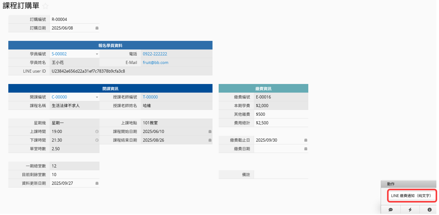 设置传送实时信息后,用户可在表单中单击下单击钮,将数据库中的值自动套用至系统管理员设计的信息格式,并传送给指定人员。与 Ragic 既有的分享或通知功能不同,此功能提供更高的客制化弹性,目前可透过 LINE 或 SMS 传送信息,例如传送客制化缴费通知、向跟踪者推入送促销信息与公告,或传送预约提醒。