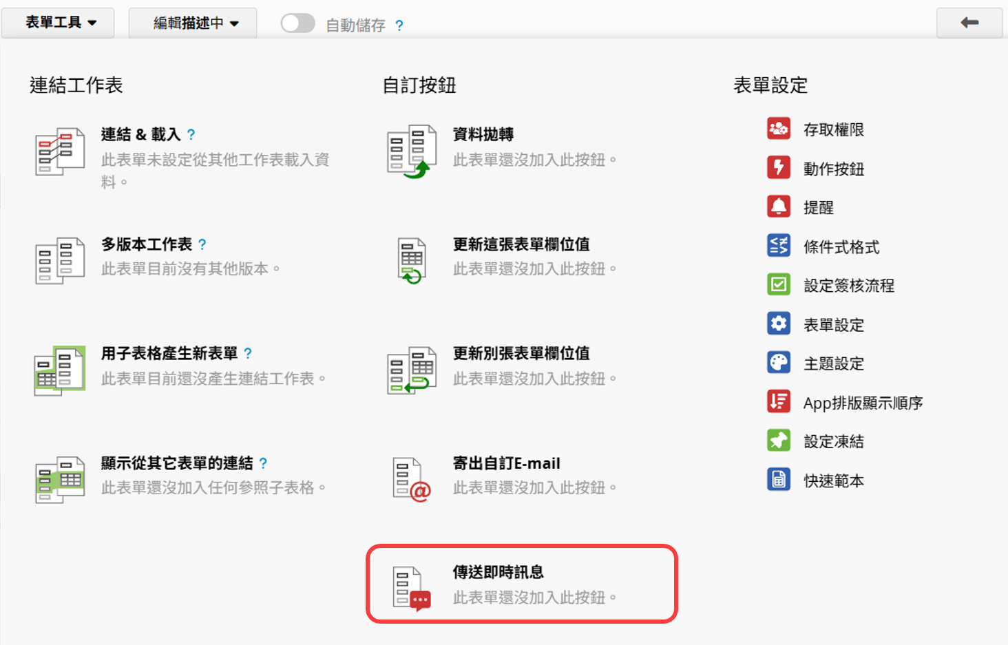 在表单页的设计模式下,点选表单工具从自订单击钮中找到传送实时信息。