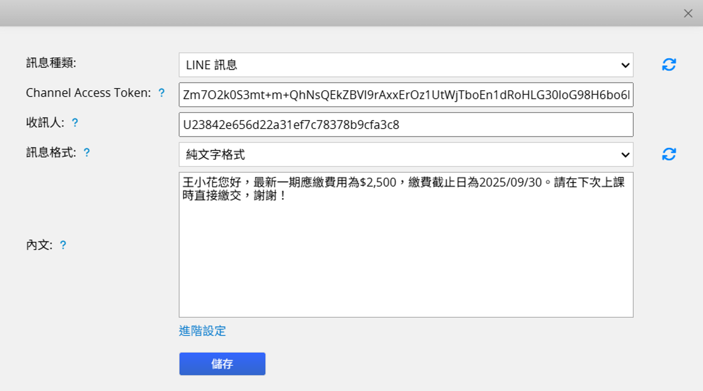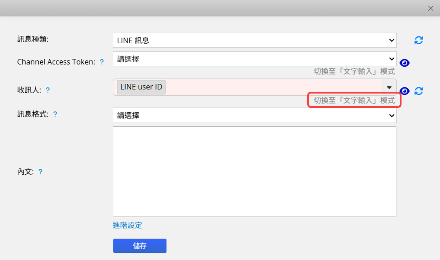 5. 内文:在此自订要传送的信息内容,并可搭配参数使用。支持参数请参阅这里。