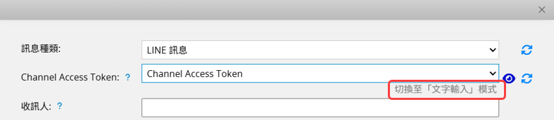 (1) 可看作让系统代表你的 LINE 官方帐号传送信息的密钥。请至 LINE Developers 后台拷贝贴上,确保 Token 权限正确。若没有做过相关设置,可参阅相关文档,了解如何启用 Messaging API 并发行 Channel Access Token。