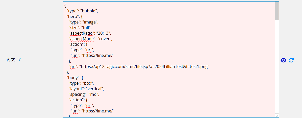(2) 若选图文排版格式(Flex Message),需要在内文区块编写 JSON(可在登录 LINE 帐号后,用 LINE 官方提供的 Flex Message Simulator 设置排版后,生成对应 JSON )。