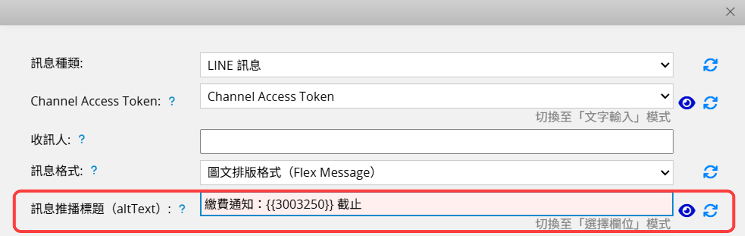(1) 信息格式选择图文排版格式(Flex Message)时才需要填写,传送 LINE 信息时,收讯人 LINE 推送通知、对话列表预览画面会显示此段字。收讯人 LINE App 无法显示图文画面时,也会以这里设置的字代换。