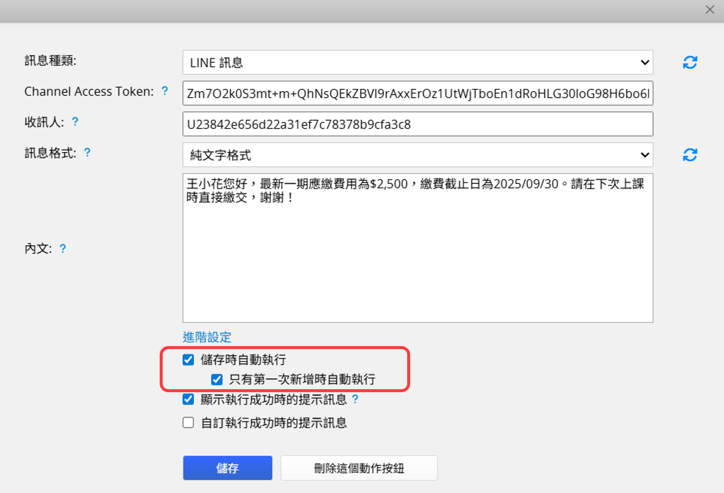 在进阶设置中可以勾选保存时自动运行。默认只有第一次新增时自动运行传送信息,若希望每次保存数据(包括新增及修改数据)都自动传送信息的话,可以撤销勾选此设置。