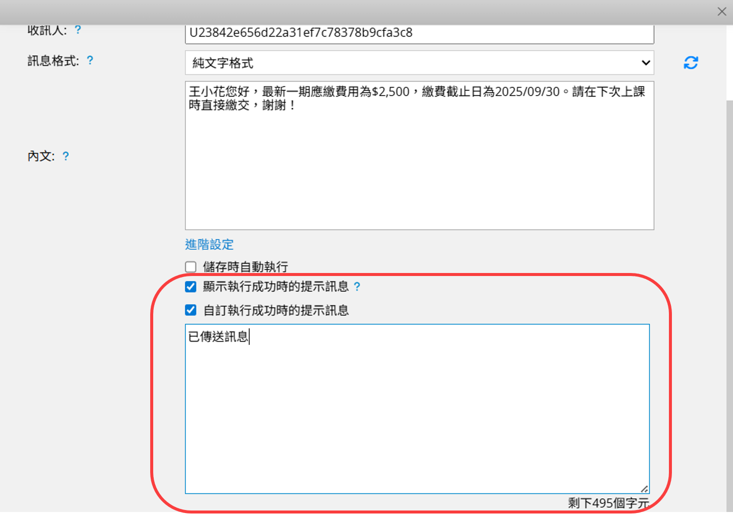 另外也可以勾选自订运行成功时的提示信息,下方会出现信息输入字段可以输入自订的提示信息,请留意字数限制。