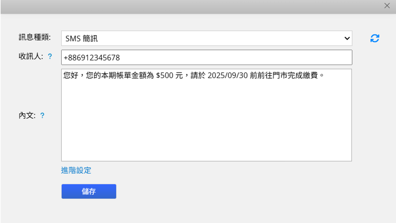 2. 内文:请注意短信字数上限为半角英数混合 160 字符(或中英文数字混合限制 70 个字),含标点符号。如超过字数限制,系统会将短信拆成不同封寄送,以封计费。相关说明请参阅此章节。可搭配参数使用。支持参数请参阅这里。