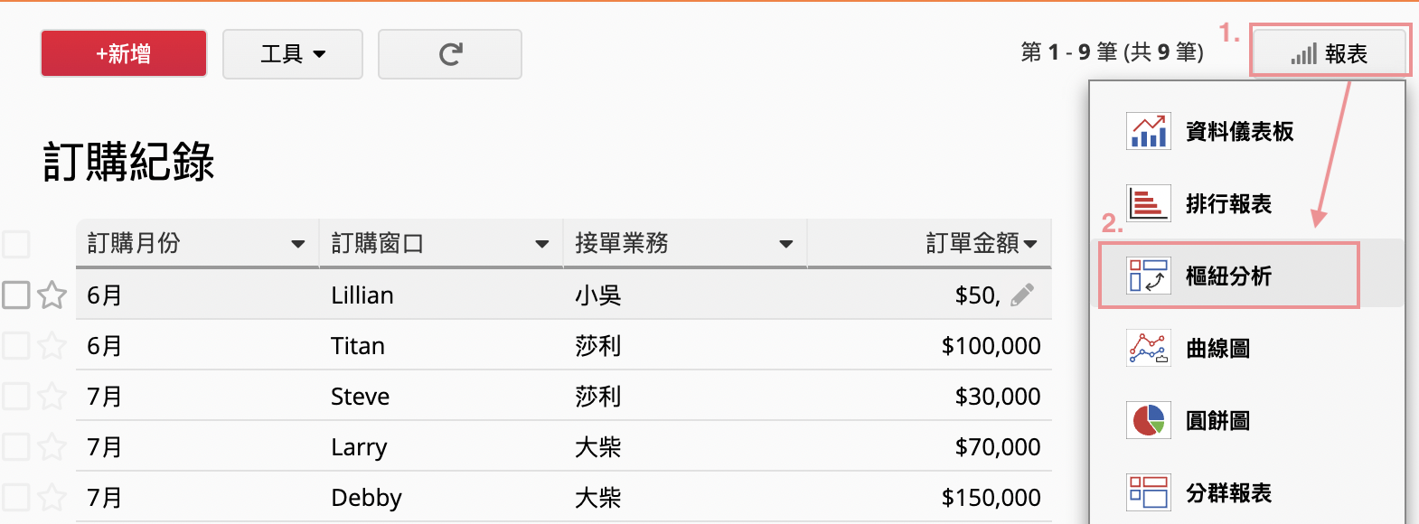 在要做樞紐分析的表單右上角,找到「報表」按鈕點擊後,點「樞紐分析」就可以進入設定畫面。