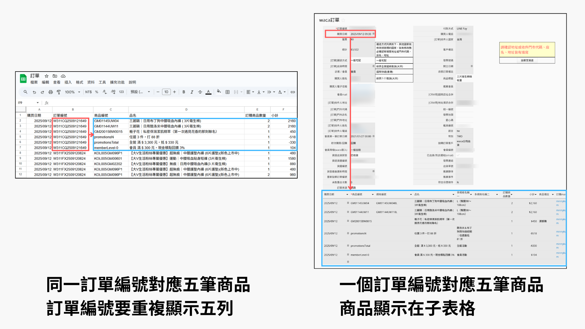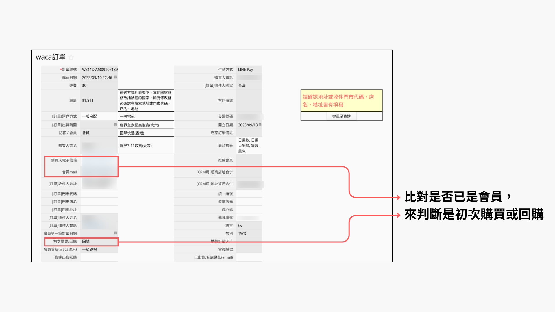 在 WACA 訂單表單裡,也能透過公式和連結到會員表單,直接比對消費者是否已經是會員,便能判斷每張訂單屬於「首購」還是「回購」。