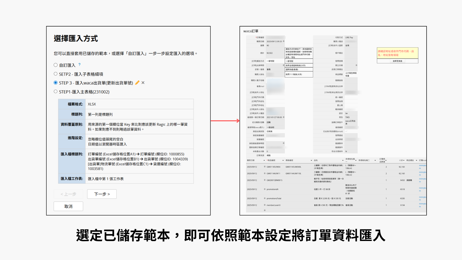 導入 Ragic 後,他們一開始是以手動匯入的方式,將自家官網、各大電商平台和實體通路的庫存資料匯入到 Ragic。由於要統整多個通路和倉庫的庫存數字,包含自家的 WACA 官網、MOMO、寶雅、康是美、第三方倉儲等,每個平台的資料格式都不一樣,Ragic 彈性的匯入格式大幅減少了資料整合上的困難。
