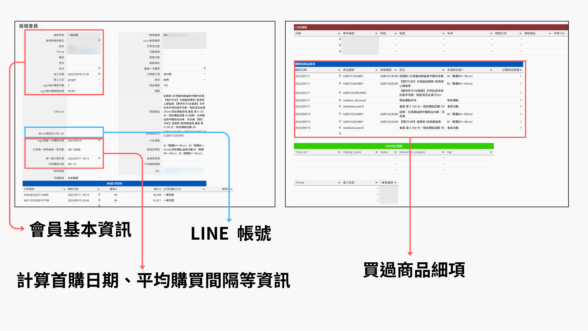 現在,他們把 WACA 的訂單與會員資訊全部匯入 Ragic,在會員表單中就能透過參照子表格,顯示過去購買紀錄,並且能用公式計算首次購買日期、最近購買日期、平均購買間隔、消費總額等資訊。
