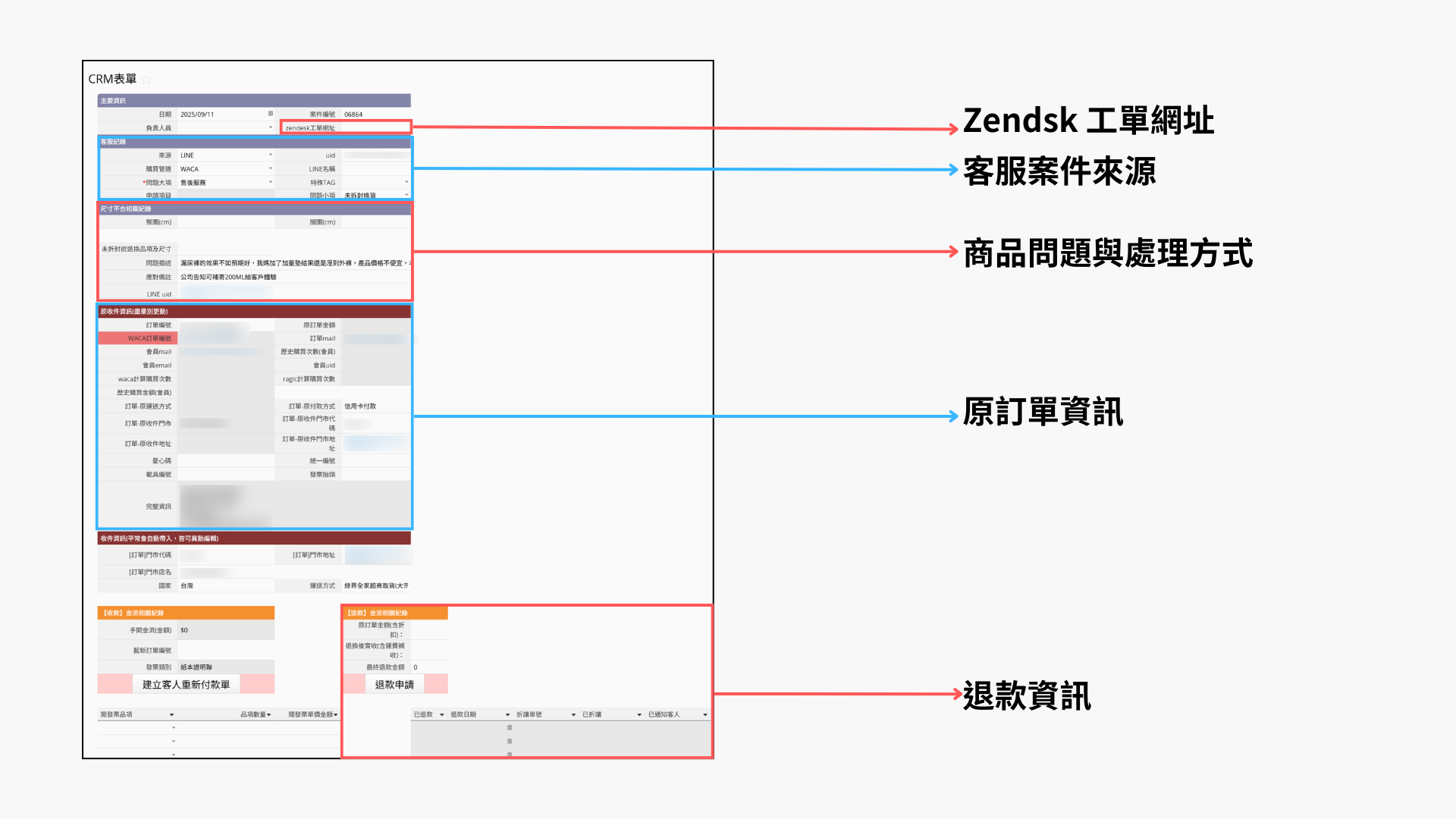 而具體的退換貨內容,會由他們的客服團隊將退換貨需求記錄在 Ragic 的 CRM 表單上,再由內部團隊處理後端手續。這張表單不僅可以連結訂單,看是哪張訂單需要退換貨之外,也能帶入會員的相關資訊,還能填寫 Zendesk 工單的網址,以利退換貨進度的追蹤。