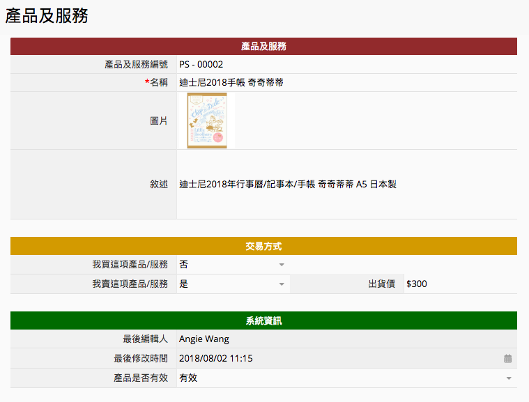 目前的名稱欄位有特別設定不可重複的屬性,因此如果是同一個產品賣給兩個不同客戶有不同的價格,就必須要分開成兩筆資料登錄唷!例如若是範例中的手帳賣給 A 與 B 客戶時是不同的價格,就必須要建立為一筆 「A 迪士尼2018手帳 奇奇蒂蒂」以及一筆「B 迪士尼2018手帳 奇奇蒂蒂」的資料。