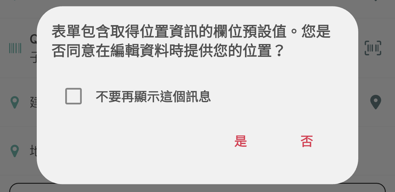 若已確認授權,但在表單中仍無法帶入地址,表示在你首次透過 Ragic App 開啟該表單時,在下圖視窗中選擇了「不同意」存取位置,並同時勾選了「不要再顯示這個訊息」。