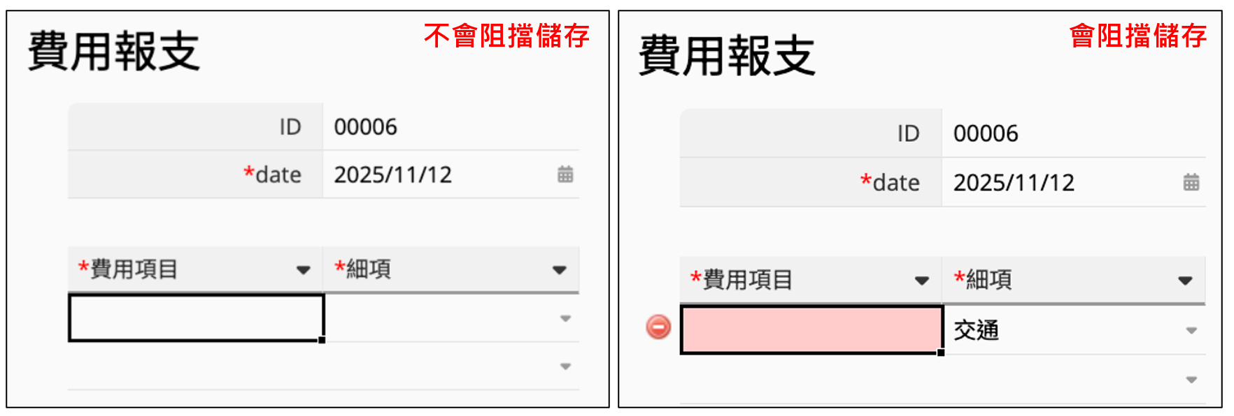 在子表格中將欄位設為必填時,代表的是只有在使用者新增子表格資料列時,系統才會檢查該列中的必填欄位是否已填寫;並不表示表單必須至少新增一列子表格資料。因此,即使完全沒有新增任何子表格資料列,表單仍然可以順利儲存。
