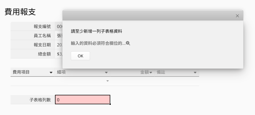 完成以上設定後,當使用者在子表格中未新增任何資料列而嘗試儲存表單時,因子表格列數未大於 0,將無法儲存表單並跳出提示訊息。
