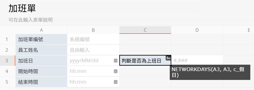 在設計例如「加班單」或「請假單」時,可能需要判斷某一天是否為工作日(平日)或假日。此時可透過 IF 條件函數搭配 NETWORKDAYS 函數來達成,請參考以下步驟。