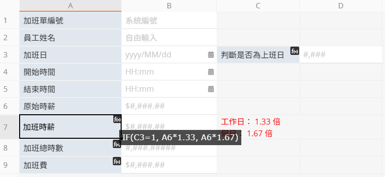 舉例來說,在加班單中,可先透過步驟二判斷「加班日期」是否為工作日,並搭配 IF 函數計算不同的加班薪資。