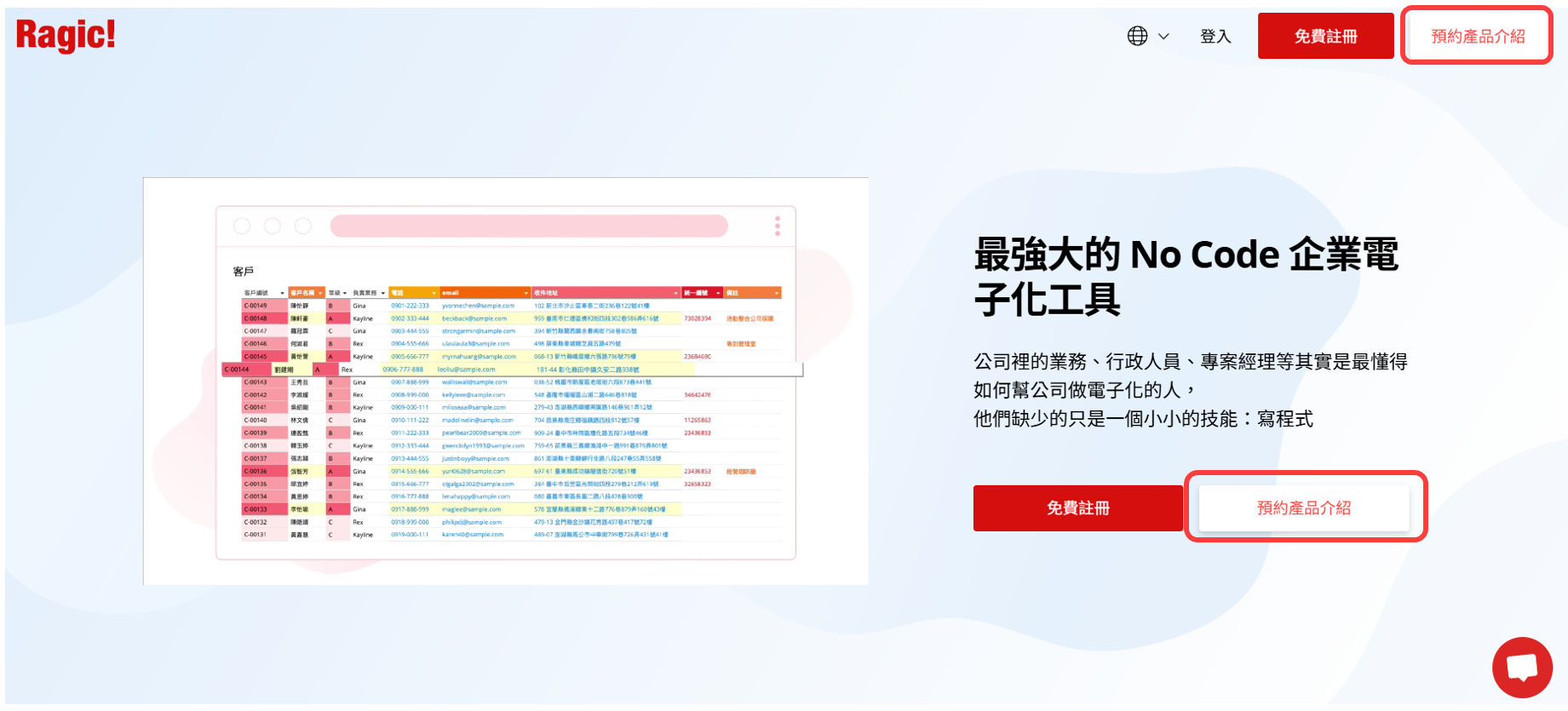如果希望與我們討論 Ragic 是否符合需求,或是根據實際使用情境建議合適的方案,歡迎點擊 Ragic 首頁的預約產品介紹按鈕(按鈕名稱錯誤),我們會安排專人與你聯繫並安排訪談時間。