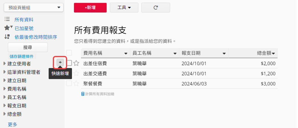 你可以透過列表頁上方欄位標題左側的 +新增 按鈕來在列表頁快速新增資料,也可使用熱鍵: Alt+N(Windows)或 Option+N(Mac)來快速新增資料。