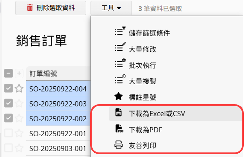 可以將勾選的資料下載成 Excel 或 CSV、下載為 PDF或是執行友善列印。