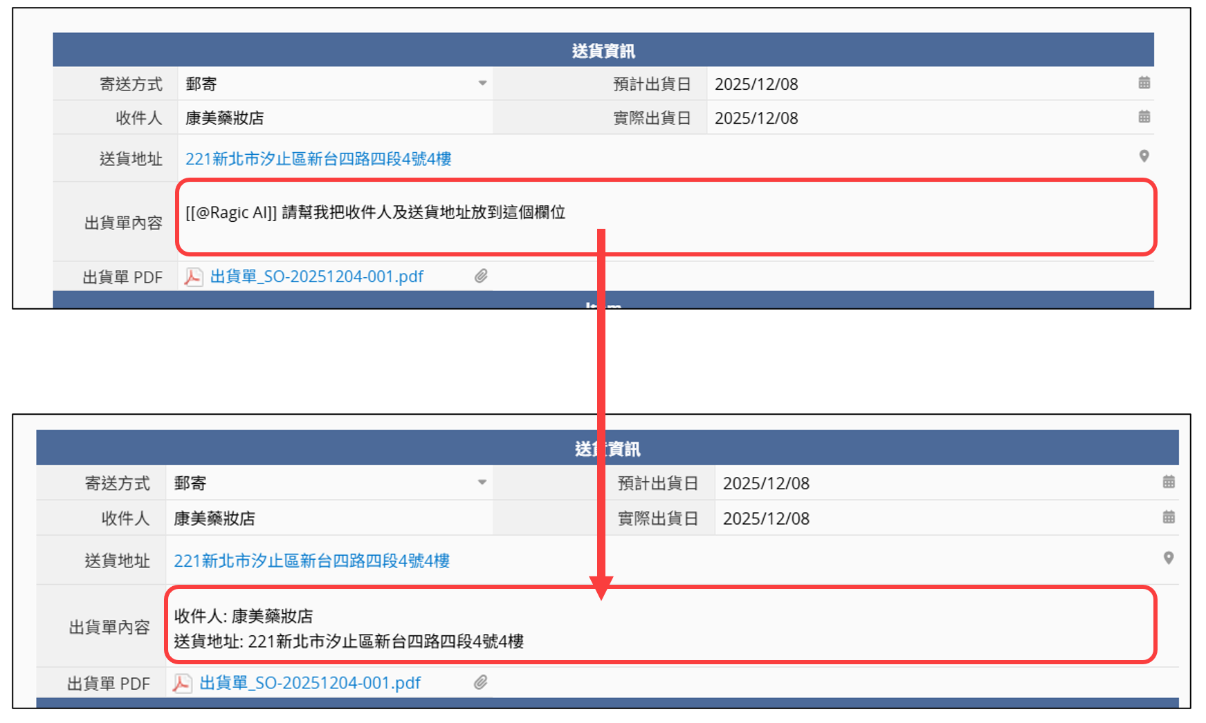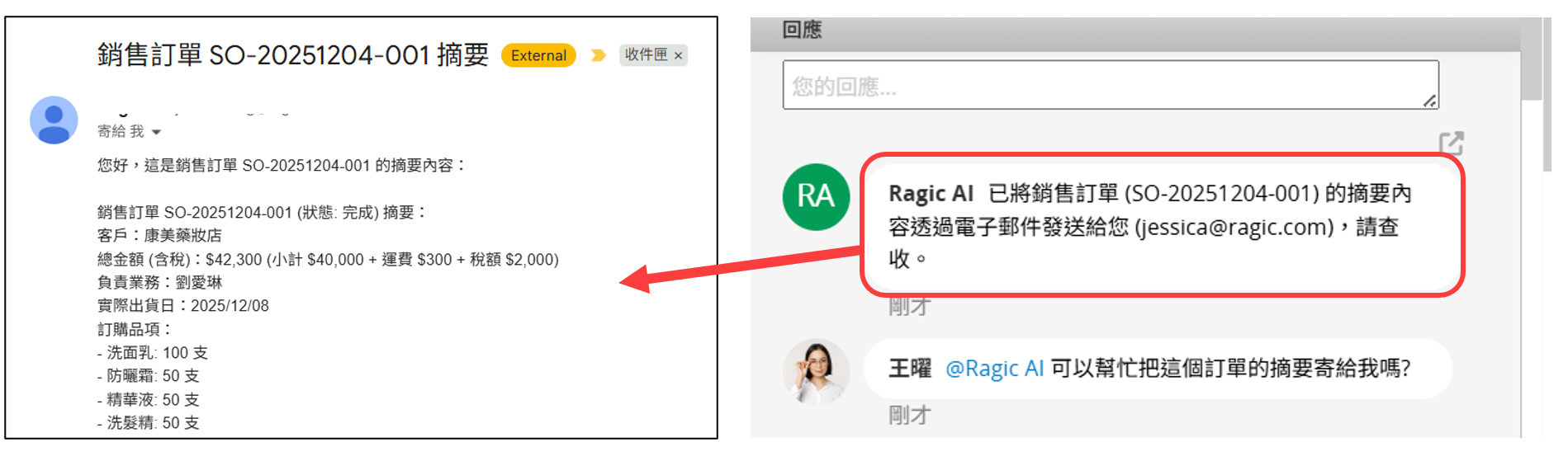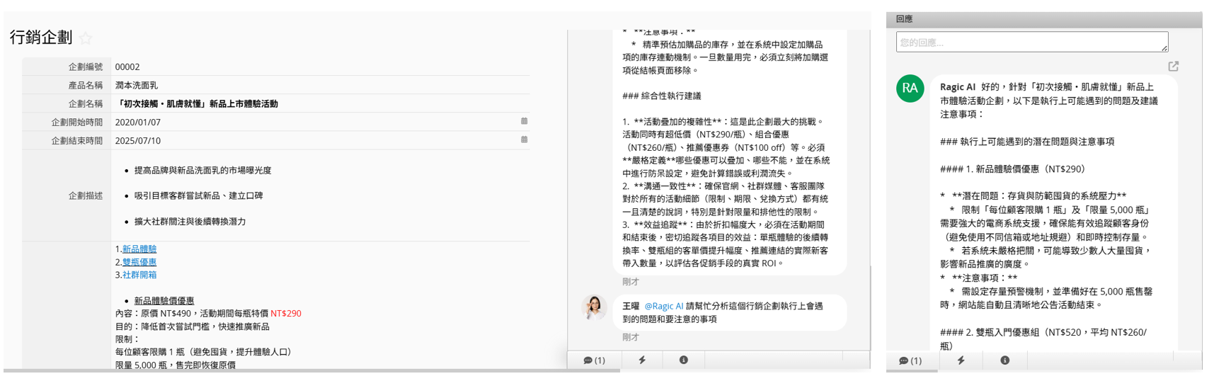 使用者可以透過提及功能輸入 @Ragic AI,在表單右下角的回應工具或於表單欄位中呼叫 AI 執行指定工作,就像在公司內部分派工作給同事一樣。Ragic AI 能協助分析表單資料、修改或新增資料、匯出文件以及寄送通知,有助於提升整體作業效率。