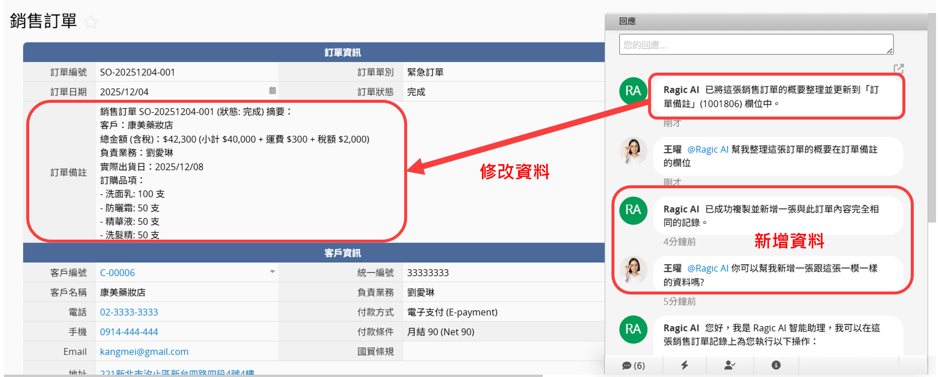 可以依照指示更新欄位內容,例如調整訂單狀態或編輯備註。也能根據需求建立新的記錄,例如新增一筆銷售訂單。