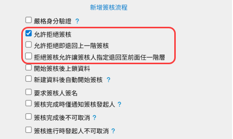 是否允許拒絕後退回上一階簽核,未啟用時拒絕會取消整個簽核流程。