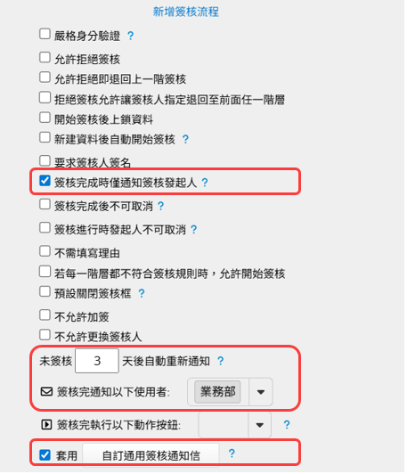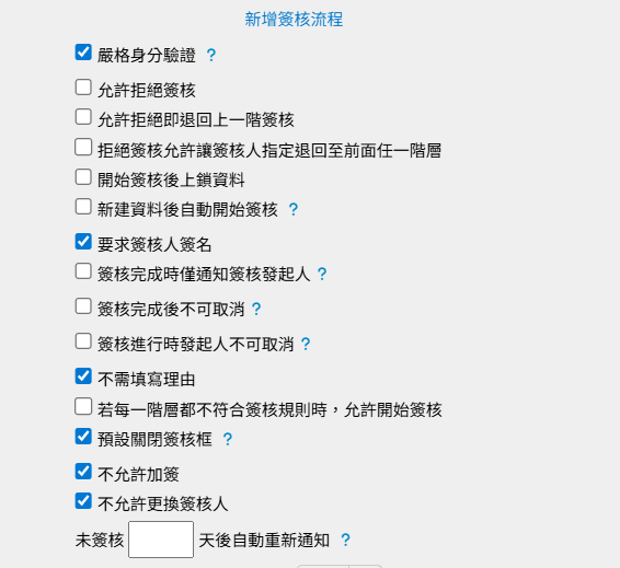 設定後,當目前簽核階層無人簽核超過特定天數,系統將重新通知該階簽核人。