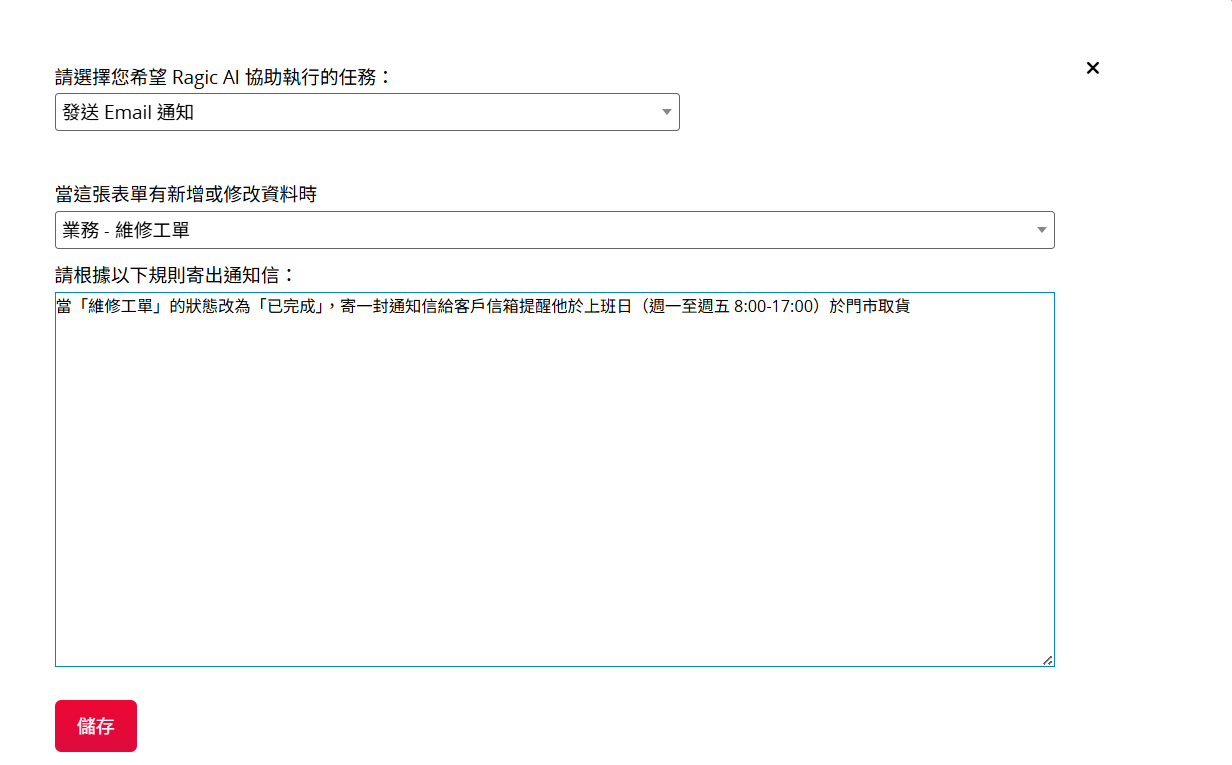 儲存後,當狀態變更為「已完成」時,Ragic AI 會自動寄送通知信。